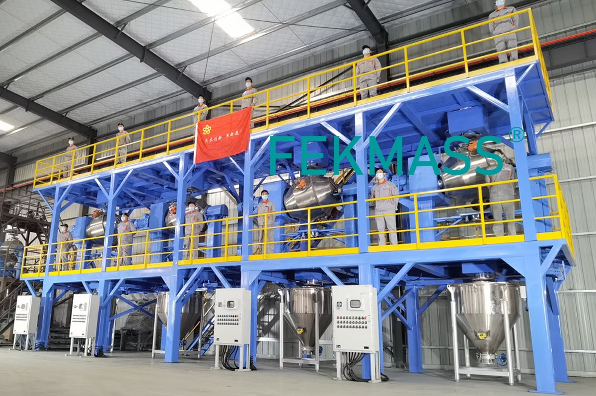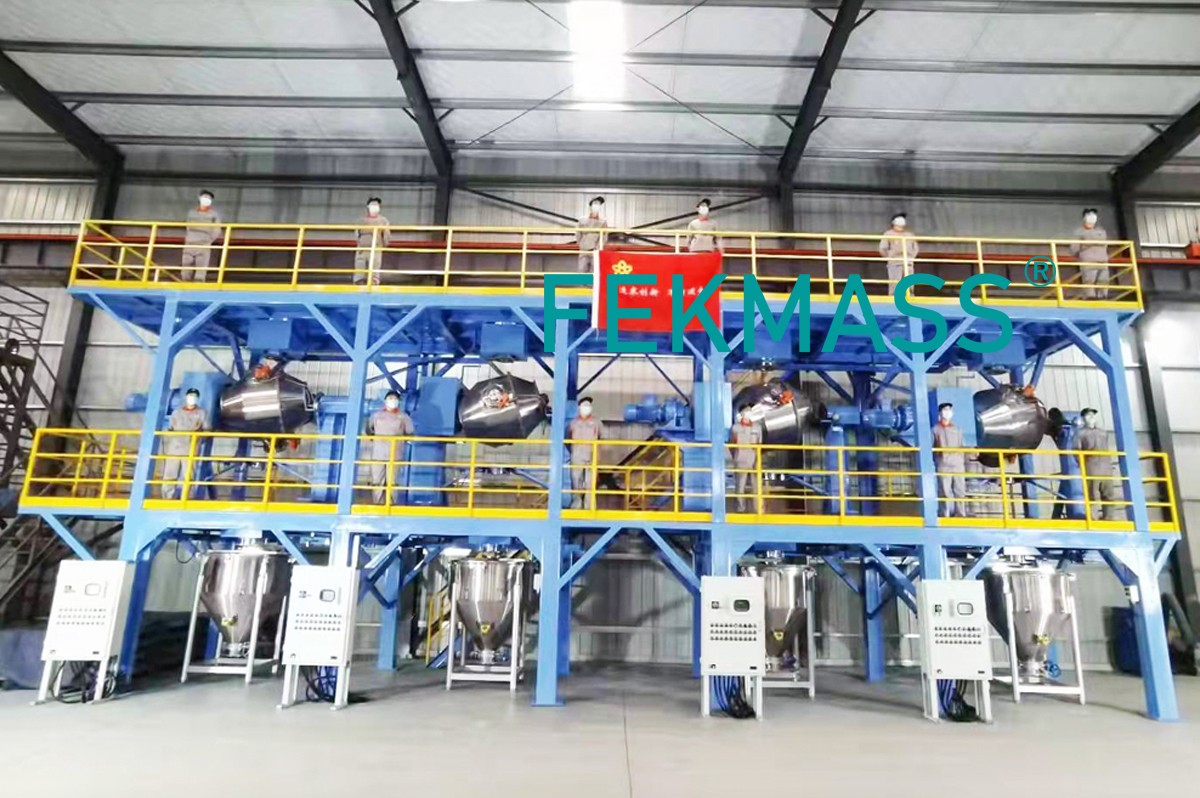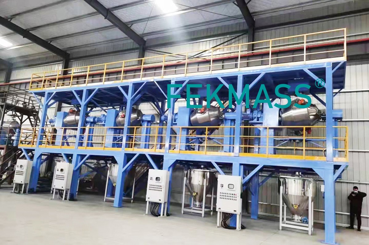 Industrial powder mixer mixing line units, 4 sets double movement mixers mixing machines, mix different industrial dry powders, with very-high efficiency, with very-high mixing uniformity.